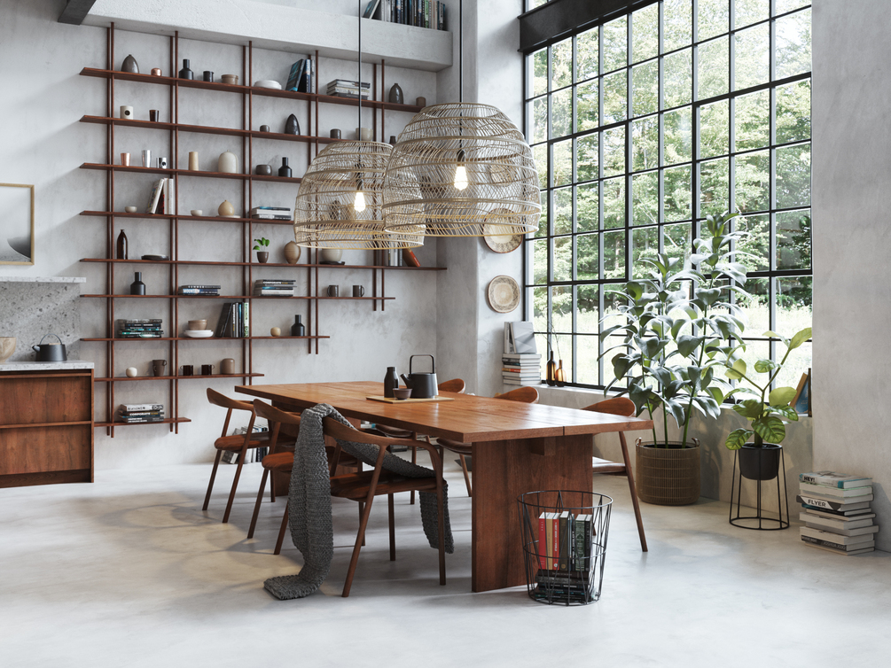 Interior design inspired by currently popular boho style. However, it's not difficult to find here also accents taken from loft aesthetics or minimalism. The climate of this interior is created primarily by accessories: thickly woven carpets, clay dishes, wicker baskets and plants. Light brings out the structure of old wood and emphasizes the unique character of ceramic accessories. This style, like probably no other, focuses our attention on original and often exotic items. There is a kind of freedom, uninhibitedness and authenticity in it. The entire interior is kept in earthy colors, so we perceive it as warm and natural. Although the color base in this composition is subdued, it is worth noting that expressive and colorful accents would also find their place here.